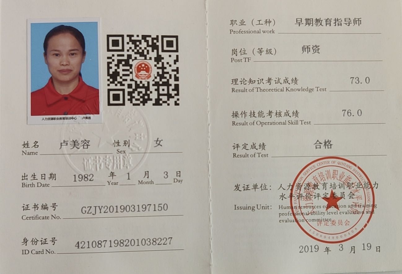 个人简介:Hi,大家好,我叫卢美容,来自广东,做事认真,有耐心,有经过专业陪训